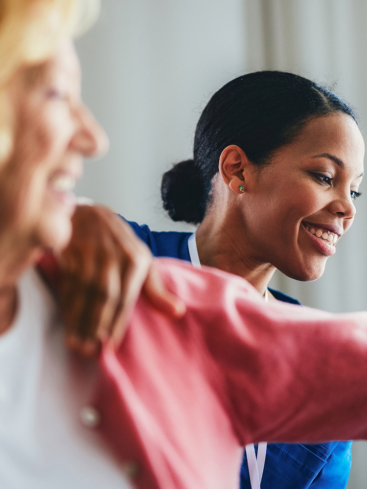 A young woman, a home health aide, supports an elderly Black man as he slowly stands up from the edge of his bed.